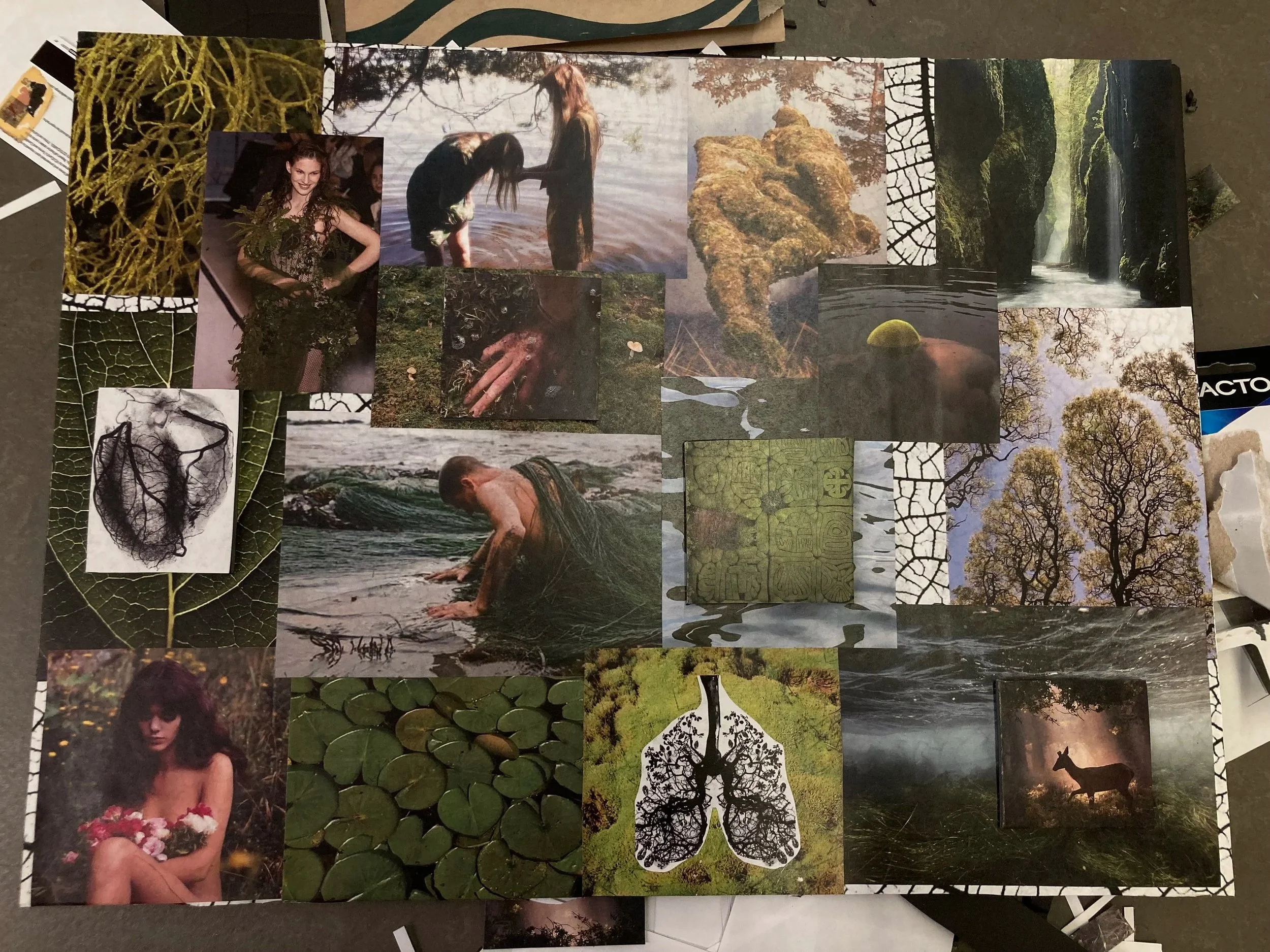 A mood board rooted in lush greens, forest textures, and organic shapes, capturing the calming strength and timeless beauty of nature as the foundation for the clothing line.